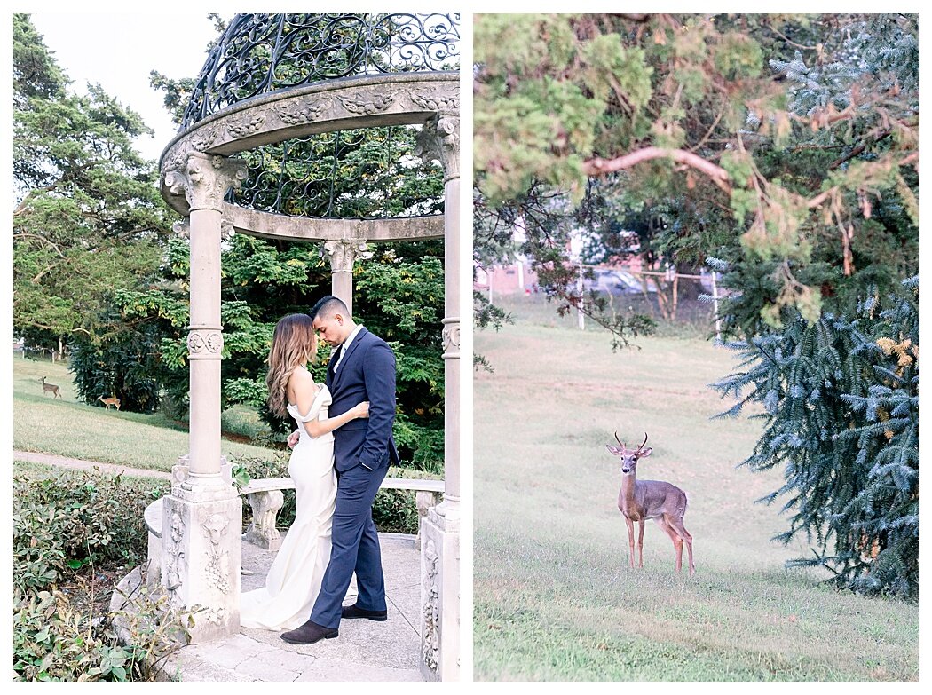 Lucy loves animals, so a puppy surprise was absolute perfection. And it’s like the wildlife at Maymont could sense how much she loves animals. As we were finishing Lucy and Chris’ portraits, we had one last stop. We made our way over to the gazebo, and the deer all started coming out of the woods.